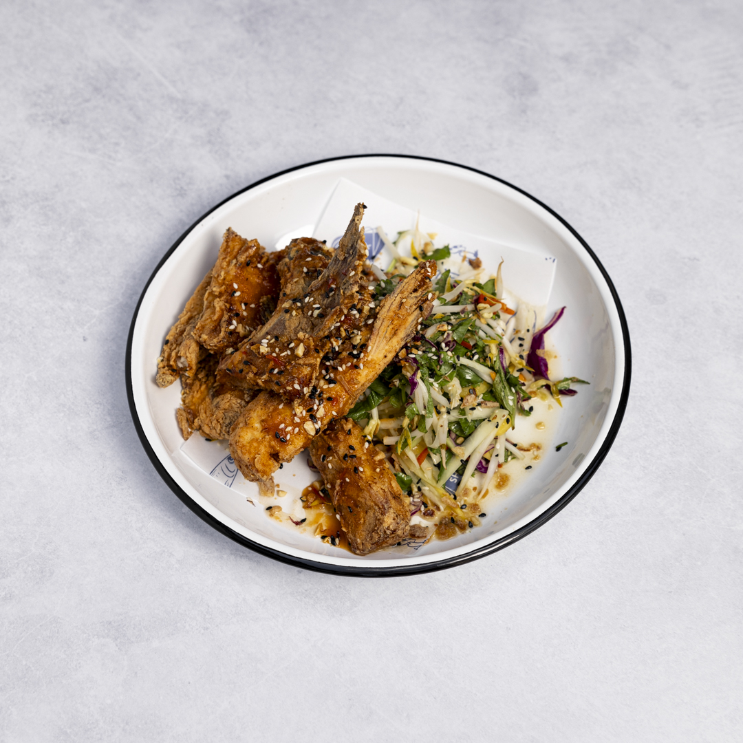 Mulloway wings, green papaya, cucumber, pickled onion and coriander salad, with fermented chilli kewpie.